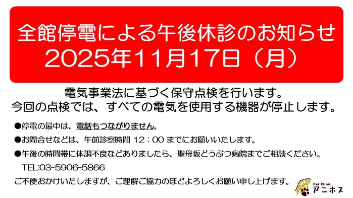 電気事業法に基づく保守点検を行います。午後は休診となります。午後の時間帯に体調不良などがございましたら、聖母坂どうぶつ病院までご相談ください。03-5906-5866ご迷惑をおかけしますが、ご協力のほどよろしくお願い申し上げます。