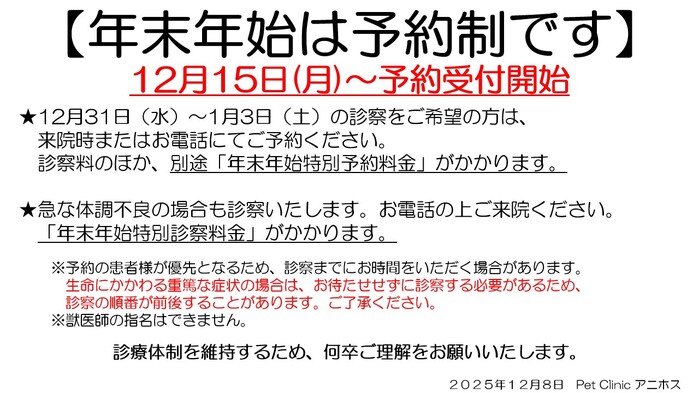年末年始の予約診療についてお知らせです。12月31日(水)~1月3日(土)の診察をご希望の方は、来院時またはお電話にてご予約ください。※診察料のほか、別途「年末年始特別予約料金」がかかります。12月15日(月)~予約受付開始です急な体調不良の場合も診察いたしますので、お電話の上ご来院ください。※「年末年始時別診察料金」がかかります。ご不明な点がございましたら、お電話もしくはアニホススタッフにお声がけください。診療体制を維持するため、何卒ご理解をお願いいたします。