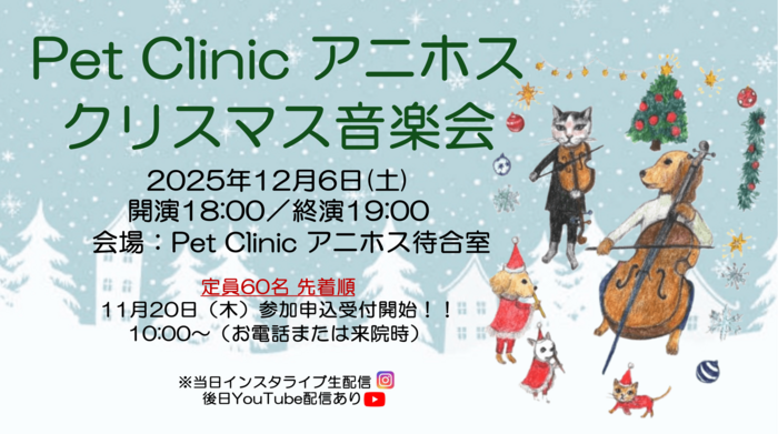 毎年、飼い主様方に大変喜んでいただけるアニホスクリスマス音楽会を今年も開催します❣️
