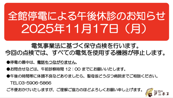 11月17日(月曜日)は午後休診です。(電気事業法に基づく保守点検のため)午後の時間帯に体調不良などがございましたら、聖母坂どうぶつ病院までご相談ください。03-5906-5866ご迷惑をおかけしますが、ご協力のほどよろしくお願い申し上げます。